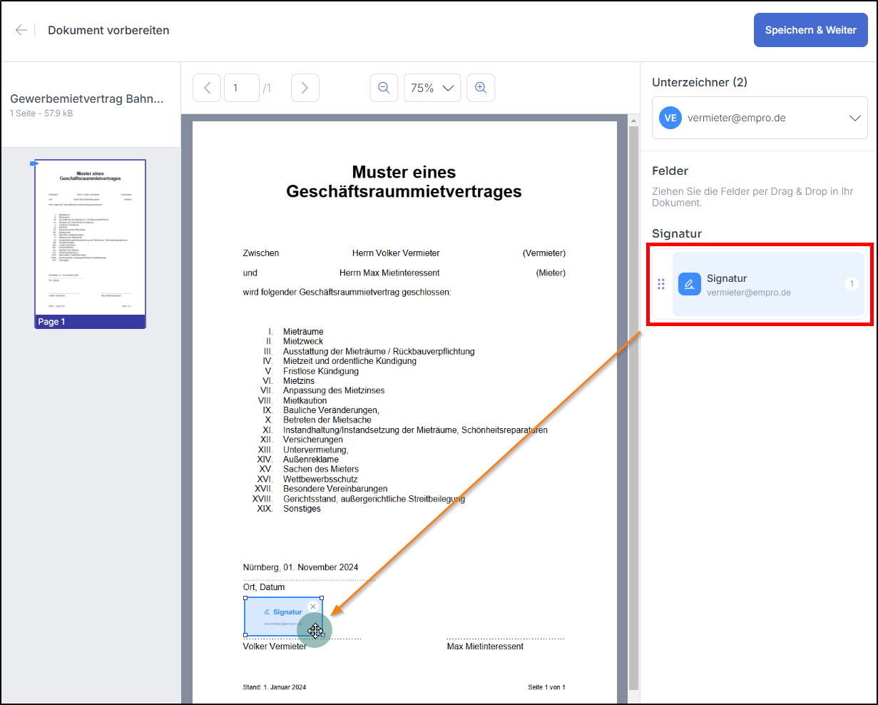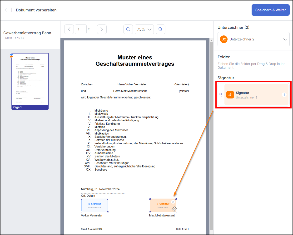 Im Dialogfeld "Dokument vorbereiten" ziehen Sie per Drag&Drop die Signaturfelder an die entsprechenden Positionen.