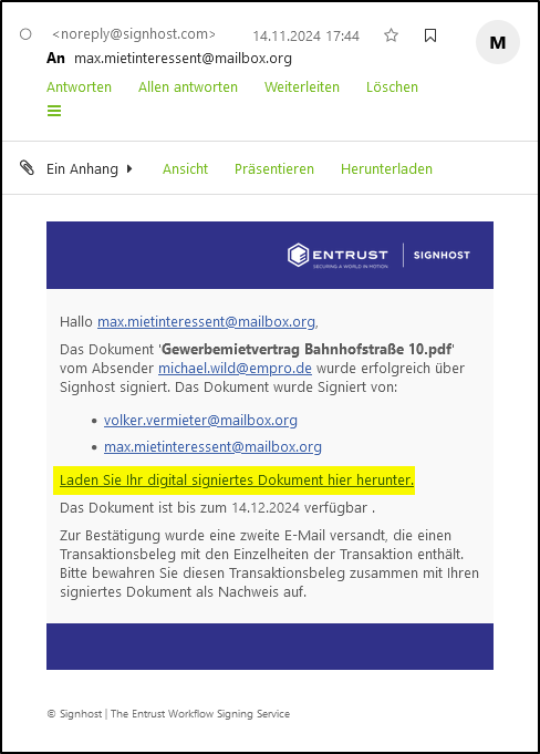 Die Information, dass ein Dokument zur Unterzeichnung vorliegt, erscheint im E-Mail-Posteingang des ersten Unterzeichners - hier der des Vermieters. Der Link in der E-Mail führt zum Vertragsdokument, welches im Browser des Unterzeichners aufgerufen wird: